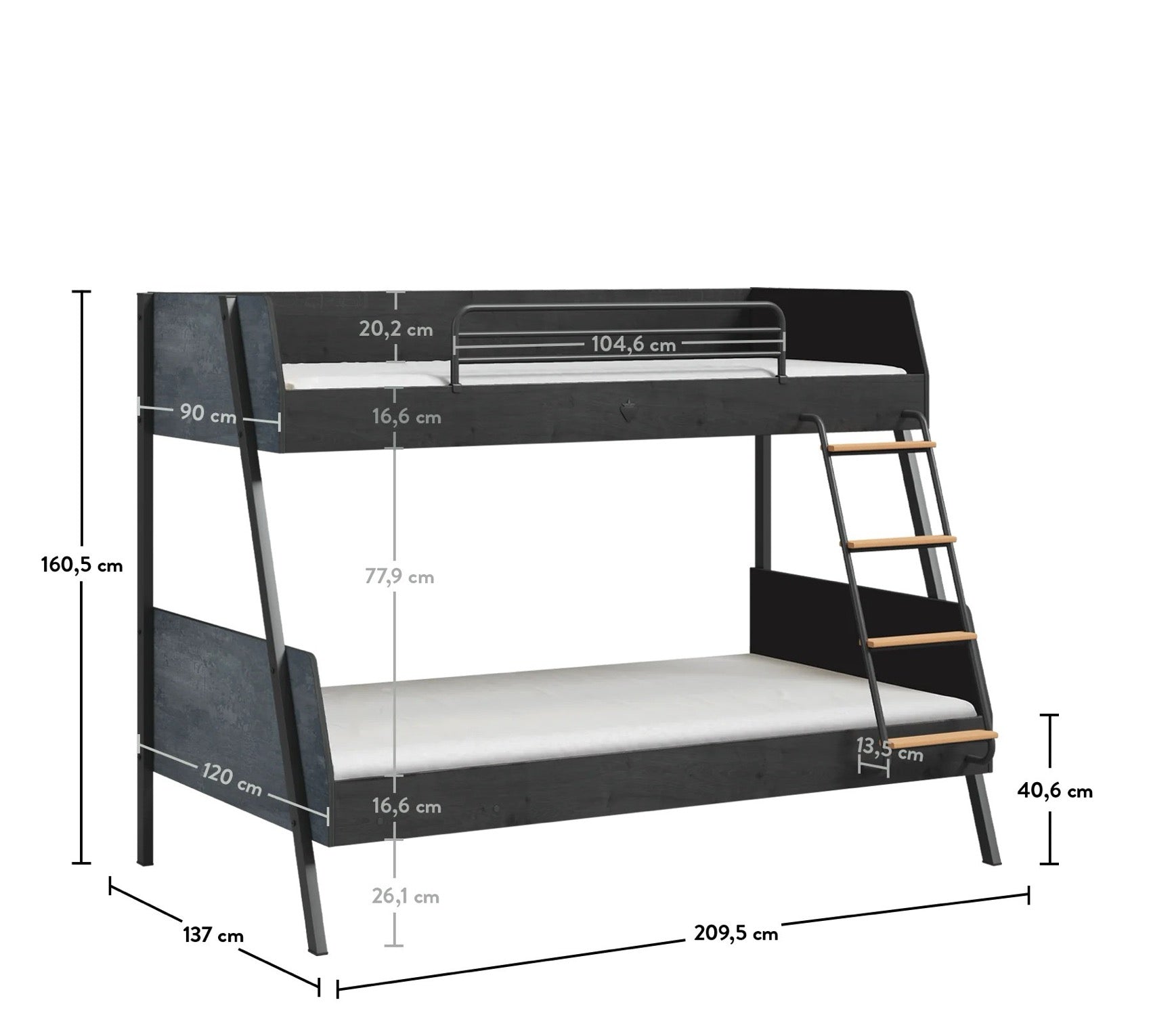 Poschodová posteľ Dark Metal je ideálnou voľbou pre študentov a rodiny, ktoré hľadajú kombináciu štýlového dizajnu a praktického využitia. S rozmermi horného lôžka 90x200 cm a spodného lôžka 120x200 cm poskytuje táto posteľ maximálny komfort a priestor v každej izbe. Jej pevná konštrukcia s nosnosťou lôžka až 130 kg zaručuje dlhú životnosť a spoľahlivosť. Schody so špeciálnou reliéfnou úpravou sú navrhnuté tak, aby minimalizovali riziko pokĺznutia a zabezpečili bezpečný pohyb medzi poschodiami. Posteľ je vyrobená z kvalitných materiálov, ktoré zabezpečujú odolnosť a dlhú životnosť. Zaoblené rohy postele zabraňujú úrazom. Rebrík postele môžete použiť z oboch strán. Konštrukcia postele umožňuje jednoduchý prístup pre robotické vysávače.