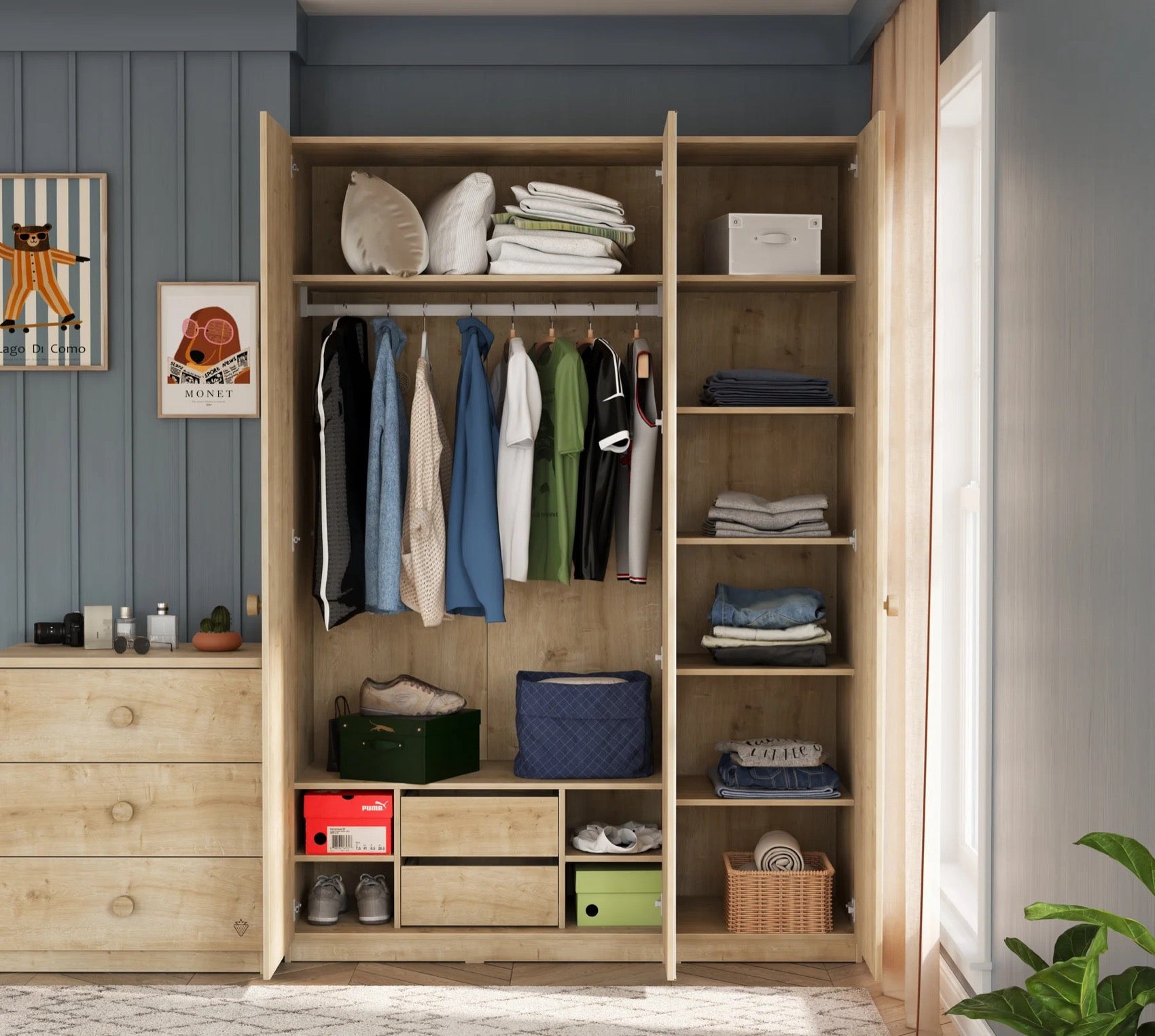 Skriňa disponuje priestranným vnútorným úložným priestorom, ktorý je flexibilne usporiadaný pomocou vešiaku, viacerých políc a praktických zásuviek. Nastaviteľné police na pravom boku umožňujú prispôsobiť úložné možnosti podľa vašich individuálnych potrieb.