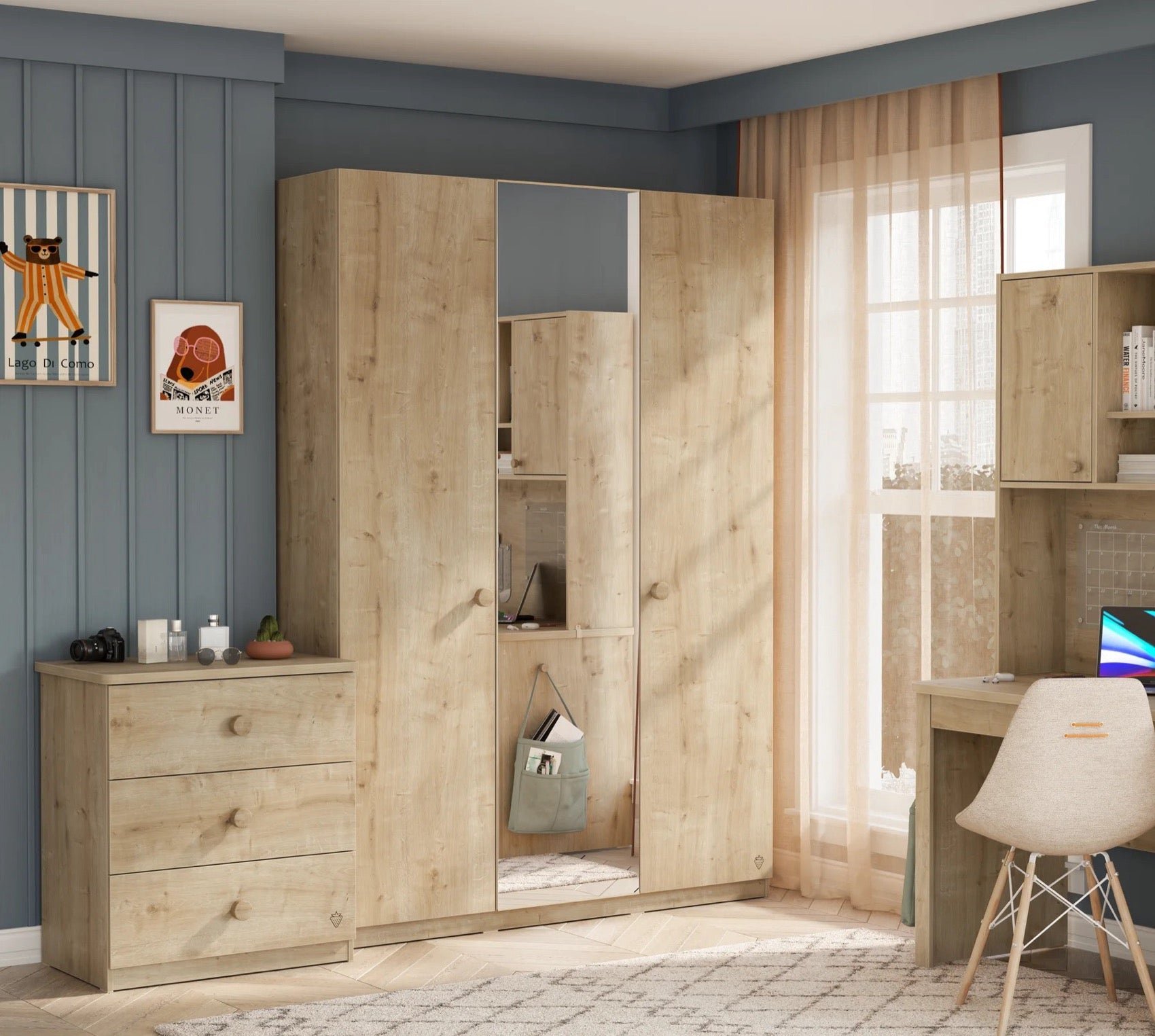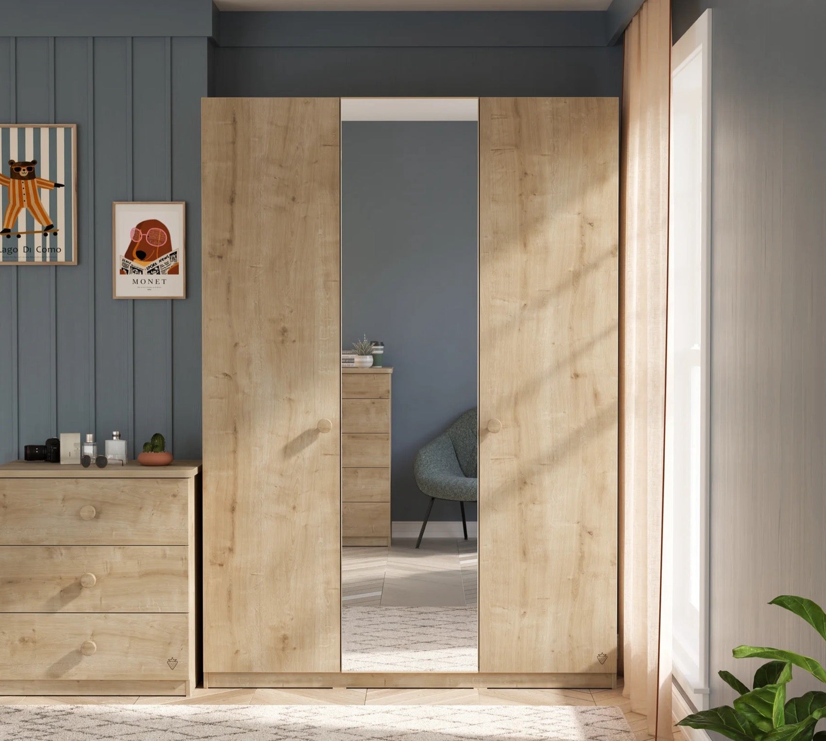 Študentská trojdverová skriňa so zrkadlom MOCHA predstavuje dokonalé spojenie moderného dizajnu a praktického využitia. S jej elegantnými líniami a prírodným zafírovým dubovým vzhľadom prinesiete do svojej izby príjemnú atmosféru a sofistikovanosť. Veľké zrkadlo na strednej časti opticky zväčšuje priestor a zároveň slúži ako neoceniteľný pomocník pri každodenných prípravách.
