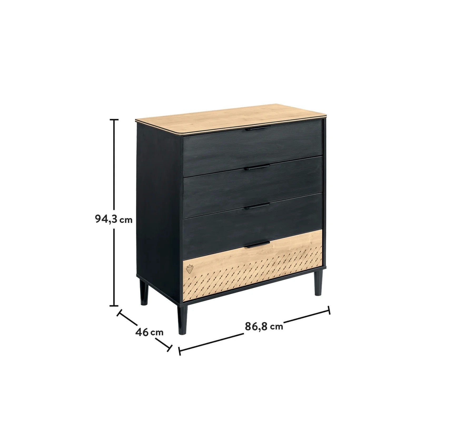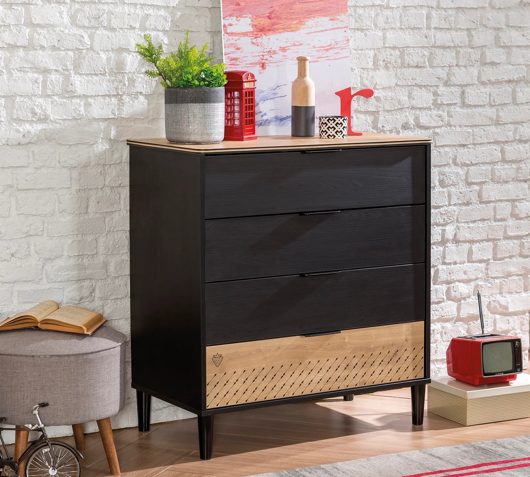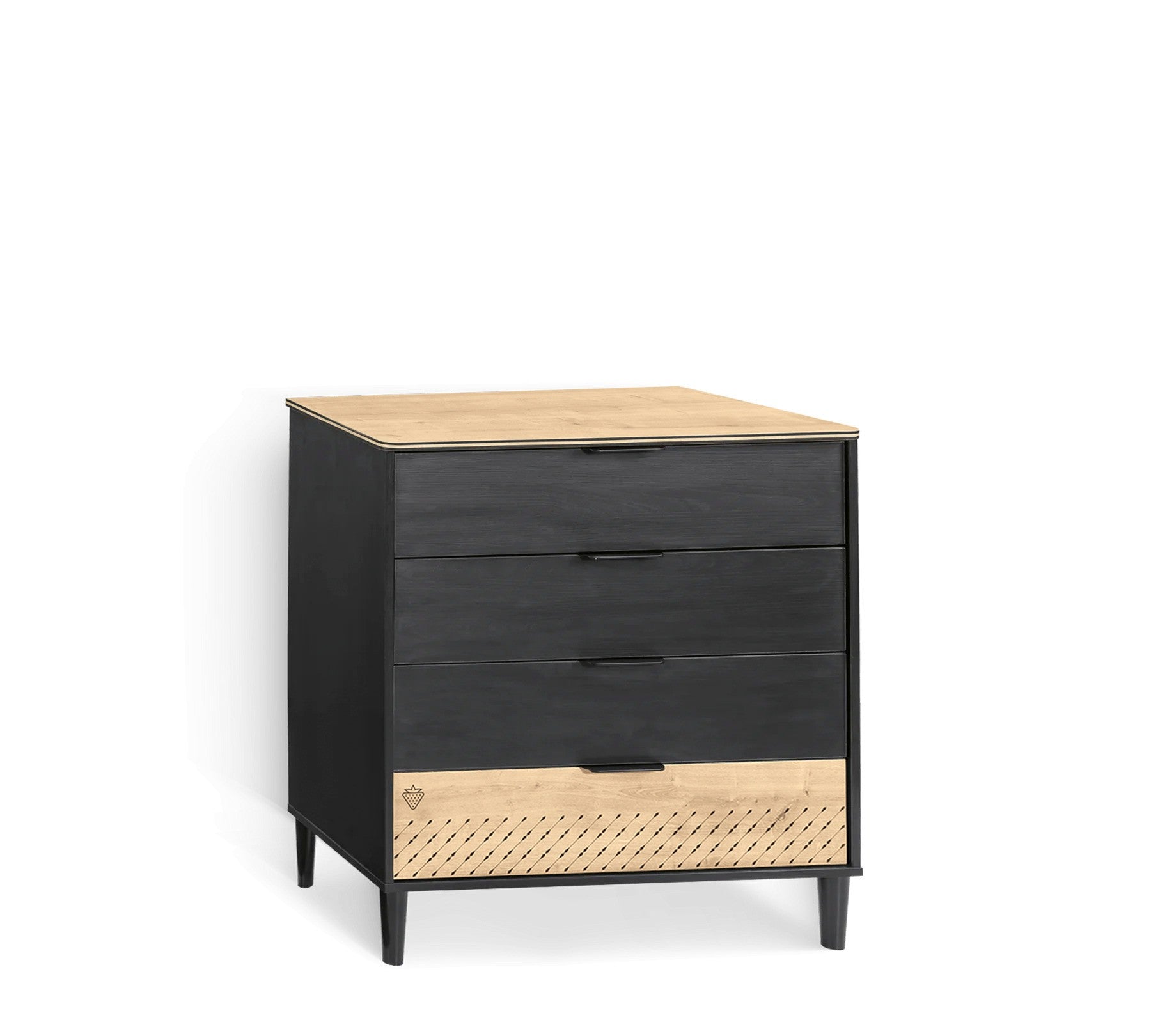 Študentská komoda BLACK je praktickým a elegantným doplnkom pre študentskú izbu. Svojím moderným dizajnom a farebnou kombináciou sa ľahko prispôsobí akémukoľvek interiéru. Komoda obsahuje štyri priestranné zásuvky. Vrchné zásuvky sú vo vnútri rozdelené priehradkou, čo pomáha udržať prehľadnosť vo veciach. Nosnosť jednej zásuvky je 15 kg. Komoda BLACK je vyrobená z kvalitného materiálu, ktorý je odolný a trvácny. Zaoblené rohy zabraňujú nebezpečenstvu a eliminujú možné úrazy.