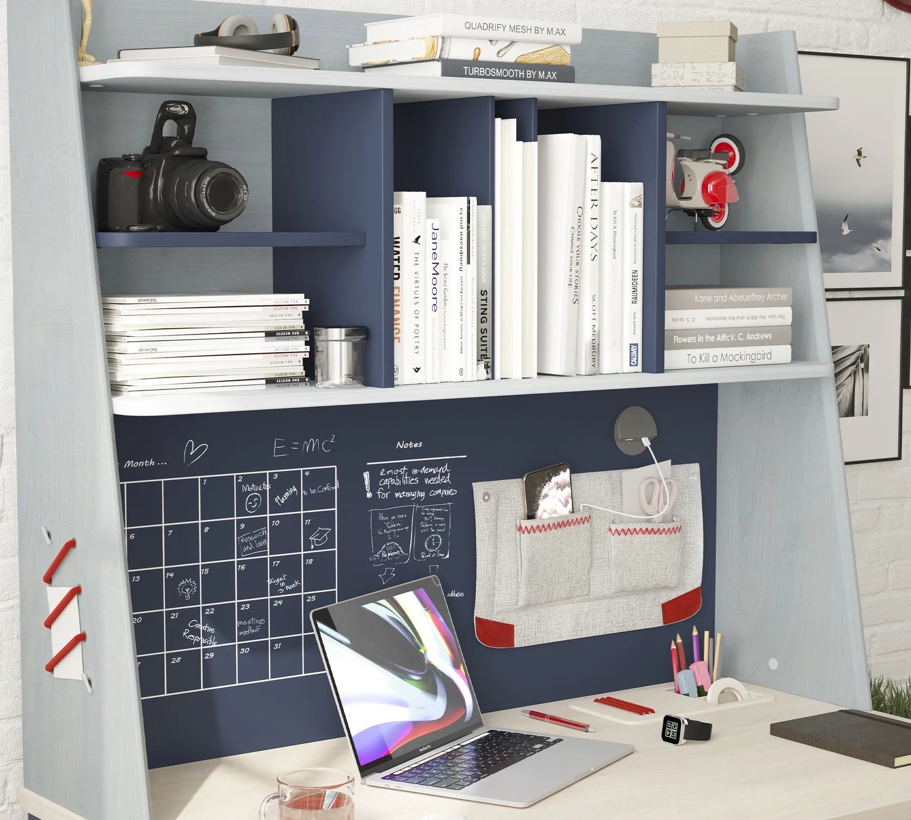 Praktické rozloženie políc vytvára usporiadaný úložný priestor s dostatkom miesta na triedenie materiálov, zatiaľ čo elastické popruhy na bočných častiach umožňujú rýchle uchytenie fotografií, poznámok alebo menších predmetov. Látkové vrecká na druhej strane sú určené na drobnosti, ktoré chcete mať po ruke, ale mimo pracovnej plochy stola. Ideálne doplní študentské pracovisko, zvýši jeho úložnú kapacitu a pomôže udržať poriadok pri každodennom štúdiu.