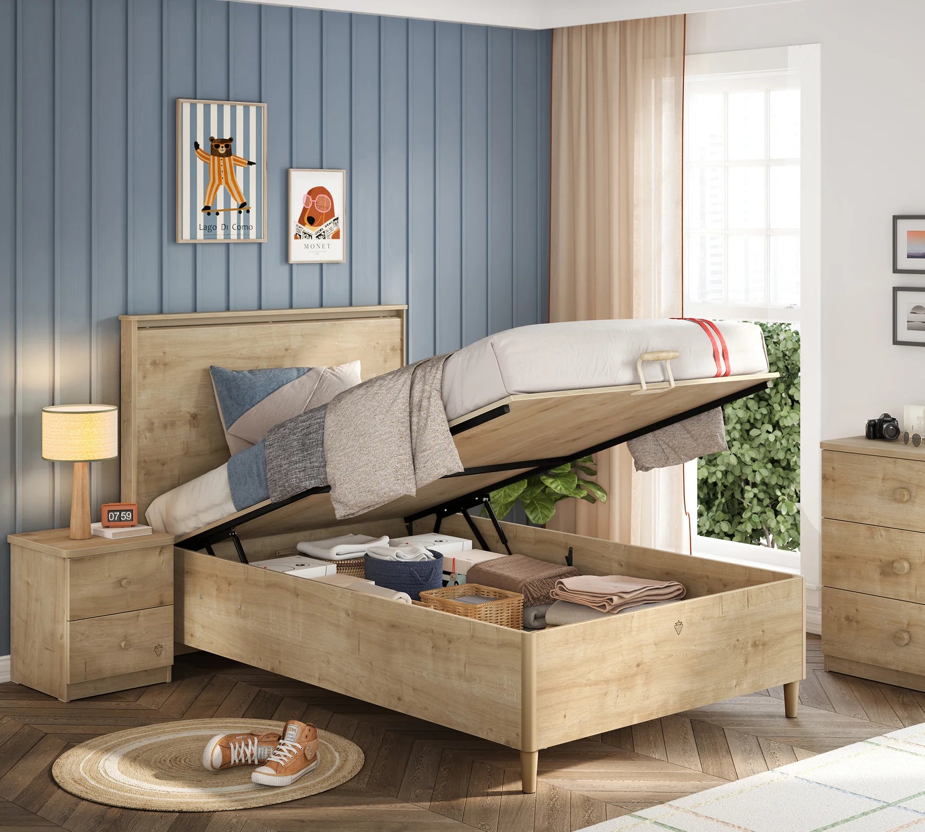 Študentská posteľ s úložným priestorom L MOCHA (100x200 cm) je navrhnutá tak, aby spĺňala požiadavky na komfort a funkčnosť. Pevná konštrukcia z drevotrieskovej dosky s melamínovou úpravou v dekore zafírový dub zabezpečuje odolnosť proti poškriabaniu a jednoduchú údržbu. Praktický úložný priestor pod lôžkom umožňuje maximálne využitie priestoru v izbe. Zdvíhací mechanizmus s tlmičovým systémom a bezpečnostným zámkom zaručuje tiché, plynulé a bezpečné otváranie a zatváranie. Nôžky postele s výškou 12 cm umožňujú priechod robotického vysávača, čo uľahčuje udržiavanie čistoty pod posteľou. Maximálna nosnosť postele je 130 kg, čo poskytuje spoľahlivú podporu pre každodenné používanie. Zaoblené rohy postele zabraňujú úrazom.