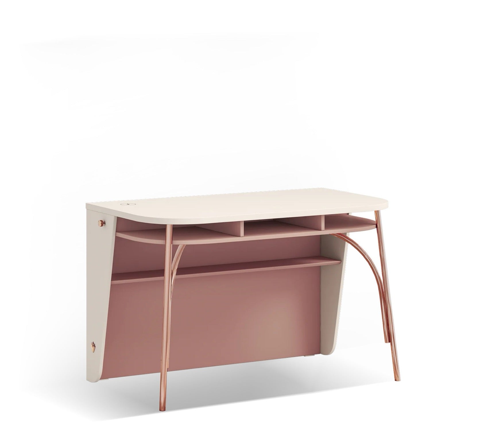Študentský písací stôl ELEGANCE s kovovými nohami je dokonalou kombináciou elegancie a funkčnosti. Harmonické prepojenie ružovej a krémovej farby dodáva miestnosti príjemnú a štýlovú atmosféru, pričom kovové nohy v ružovom zlate zvýrazňujú jeho moderný a luxusný charakter. Ergonomické rozmery stola zaručujú maximálny komfort a produktivitu pri práci, zatiaľ čo praktické vešiaky na tašky, umiestnené po oboch stranách, sa postarajú o poriadok. Stôl poskytuje otvorený policový systém, ktorý ponúka dostatok úložného priestoru. Inovatívnym prvkom je funkcia bezdrôtového nabíjania, integrovaná do vrchnej časti stola a označená laserovou potlačou. Zaoblené rohy stola zabraňujú úrazom. Pre ešte viac úložného priestoru si k stolu môžete dokúpiť nadstavbu zo série ELEGACE.